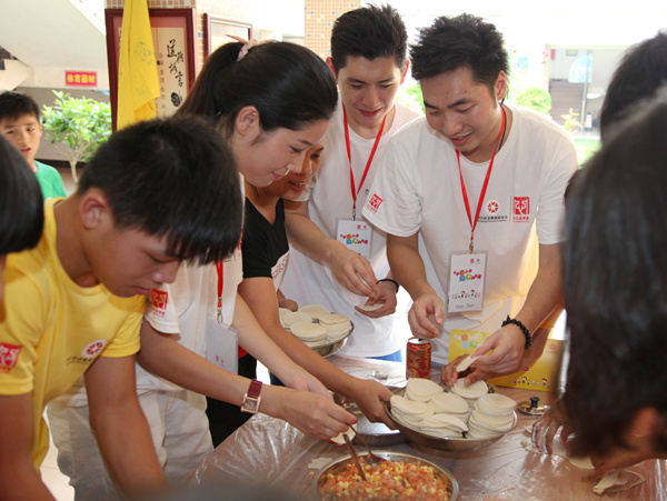 義工和孩子們組成了八個(gè)小家庭,家庭里的每個(gè)人都有各自的角色,每個(gè)家庭都有一張任務(wù)卡,家庭成員通過分工合作,共同體驗(yàn)了包餃子比賽、爬山等游戲。28日晚上,一場別開生面的聯(lián)歡晚會(huì)再一次拉近了義工和孩子們的距離,為了展示各自的小家庭,大家紛紛利用各種閑暇時(shí)間出點(diǎn)子、勤排練,原本還有些生疏的“家人”,很快就熱乎了起來,汗水和歡笑揮灑在福利中心的每一個(gè)角落里。