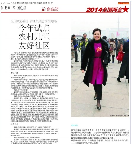 一如往年,全國政協(xié)委員、香江集團(tuán)總裁翟美卿在全國兩會(huì)上繼續(xù)保持了對(duì)農(nóng)村留守兒童問題的關(guān)注。她今年的5個(gè)提案中,其中一個(gè)還是關(guān)于留守兒童,她在接受南都專訪時(shí)表示,“如果政府不參與、不牽頭,(農(nóng)村留守兒童)這個(gè)問題解決不了!